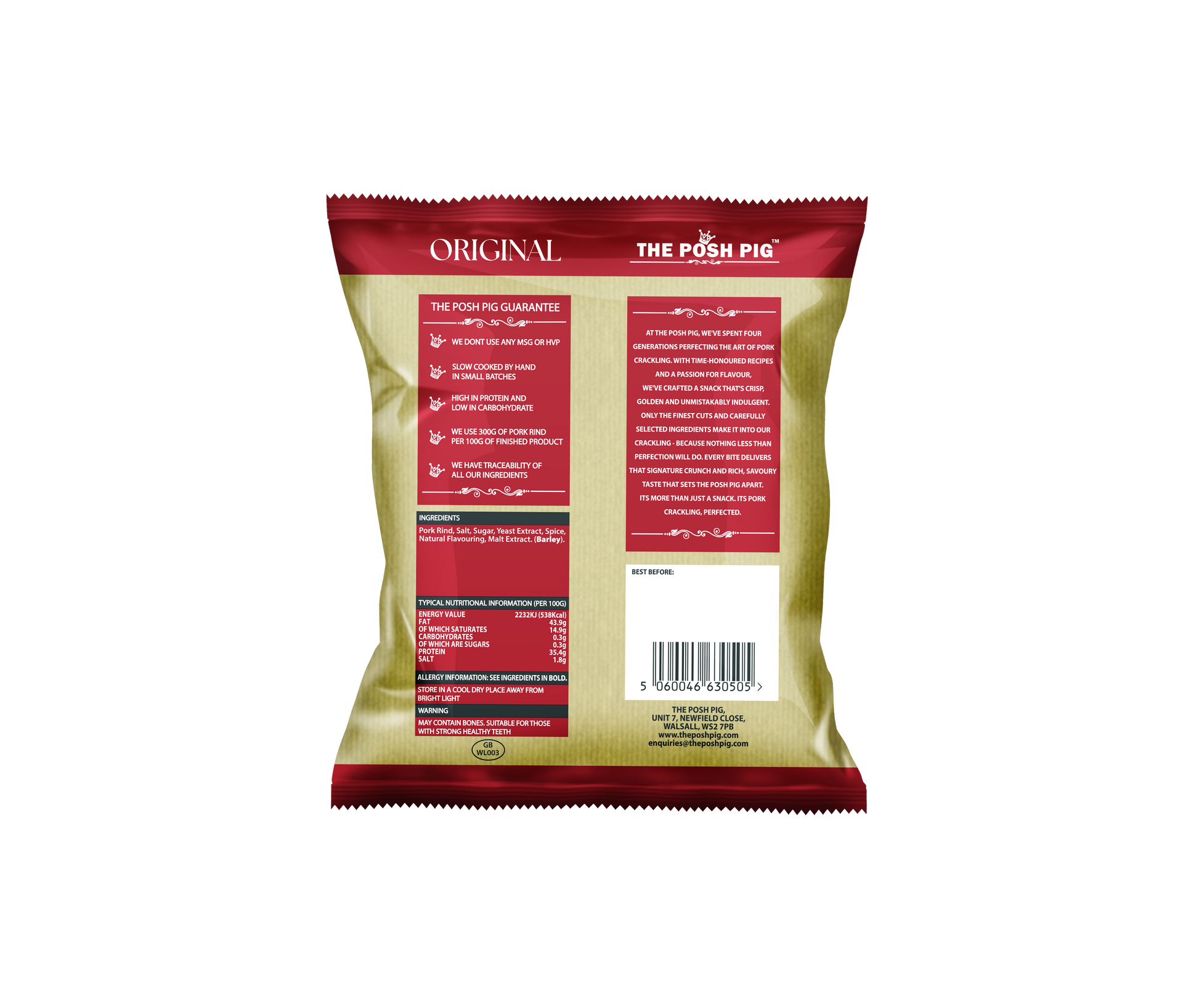 Get ready to indulge in our Original flavoured Pork Crackling! Lightly salted for that classic taste, this snack is perfect for any occasion.